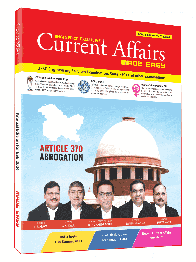 This Annual 2024 Edition of the MADE EASY Engineers’ Exclusive Current Affairs Magazine covers news events beginning from January to December, 2023. The Magazine has comprehensive coverage of all the topics from current affairs, neatly categorized into major sections like Economic Issues, Environment & Wildlife, National Affairs, International Affairs, Science & Tech, Defense, and Miscellaneous which comprises Sports, Awards & Honors, Person in News and Books & Authors.